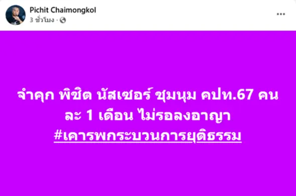 วันที่ 4 กุมภาพันธ์ 2569 ที่ศาลแขวงดุสิต ศาลนัดฟังคำพิพากษาคดีหมายเลขดำที่ อ387/2568 ซึ่งพนักงานอัยการพิเศษฝ่ายคดีศาลแขวง 3 เป็นโจทก์ฟ้อง นายนัสเซอร์ หัวหน้ารักษาความปลอดภัย เครือข่ายนักศึกษาประชาชนปฏิรูปประเทศไทย (คปท.) เป็นจำเลยที่ 1 และนายพิชิต แกนนำ คปท. เป็นจำเลยที่ 2 ในความผิดตามพระราชบัญญัติการชุมนุมสาธารณะ พ.ศ. 2558