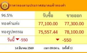 าคาทองคำวันนี้ 14 มีนาคม 2569 โดย สมาคมค้าทองคำ ประกาศราคาทองครั้งที่ 1 (เปิดตลาด) เมื่อเวลา 09.04 น. ปรับลงพรวดเดียว 550 บาท สู่บริเวณ 77,300 บาท