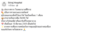 จึงกำหนดให้จ่ายยาและเวชภัณฑ์ สำหรับผู้ป่วยนอกทุกสิทธิ์ ในระยะเวลาไม่เกินครั้งละ 1 เดือน โดยให้นัดรับยาเพิ่มเติม (Refl) ในส่วนที่เหลือ กรณีที่ผู้ป่วยมีนัดจะออกใบเติมยา โดยรับยาได้ทั้งทางไปรษณีย์หรือมารับที่โรงพยาบาลศิริราช เริ่มตั้งแต่วันที่ 18 มีนาคม 2569 เป็นต้นไป