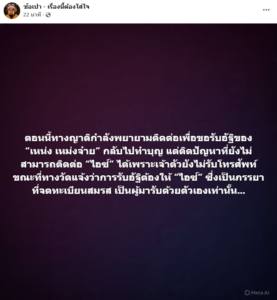 ล่าสุด เพจดัง ซ้อเปา – เรื่องนี้ต้องใส่ใจ ระบุว่า ขณะนี้ญาติของเหน่งกำลังพยายามติดต่อเพื่อขอรับอัฐิกลับไปประกอบพิธี แต่ยังไม่สามารถติดต่อ ไอซ์ ได้ เนื่องจากไม่รับโทรศัพท์ โดยทางวัดแจ้งว่าการรับอัฐิต้องให้ไอซ์ ซึ่งเป็นภรรยาที่จดทะเบียนสมรส เป็นผู้มารับด้วยตัวเองเท่านั้น… พร้อมทั้งมีการกล่าวถึงข้อกฎหมายว่า หากคู่สมรสเสียชีวิต ผู้ที่ไม่มีสถานะทางทะเบียน เช่น พ่อแม่หรือพี่น้อง อาจไม่มีสิทธิ์รับอัฐิแทนได้