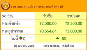 ราคาทองคำตลาดบ่ายวันนี้ 6 เมษายน 2569 หลังเช้านี้ สมาคมค้าทองคำ ประกาศราคาทองครั้งที่ 1 (เปิดตลาด) เมื่อเวลา 09.03 น. ปรับตัวลงแรง 600 บาท สู่บริเวณ 71,600 บาท