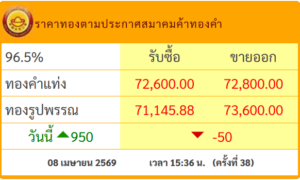 ราคาทองคำวันนี้ 8 เมษายน 2569 โดย สมาคมค้าทองคำ ประกาศราคาทองครั้งที่ 1 (เปิดตลาด) เมื่อเวลา 09:03 น. ปรับตัวขึ้นแรง 1,250 บาท สู่บริเวณ 73,100 บาท ราคาซื้อขายทองคําในประเทศชนิด 96.5%