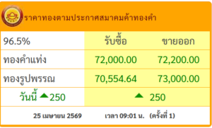โดยราคาซื้อขายทองคำในประเทศชนิด 96.5% ประจำวันเสาร์ที่ 25 เมษายน 2569 (ประกาศครั้งเดียว) มีรายละเอียดดังนี้: