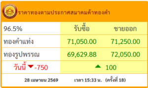 สำหรับราคาซื้อขายทองคำแท่งและทองรูปพรรณชนิด 96.5% ในประเทศ ประจำวันอังคารที่ 28 เมษายน 2569 (ประกาศครั้งที่ 1) มีรายละเอียดดังนี้