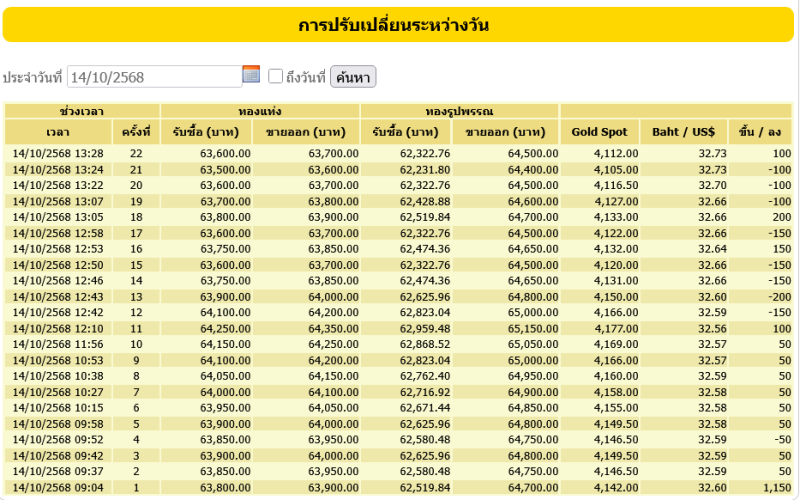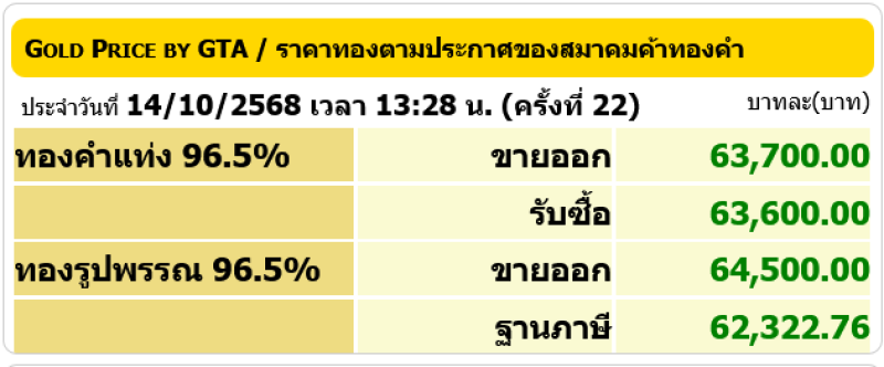 สำหรับราคาทองคำเปิดตลาดประจำวันที่ 14 ตุลาคม 2568 เปิดตลาดปรับขึ้น 1,150 บาท ในครั้งที่1 ต่อมามีการปรับขึ้น-ลง รวมแล้ว 22 ครั้ง โดยทองรูปพรรณขายออกบาทละ 64,500 ตามข้อมูลจากเว็บไซต์ของ สมาคมค้าทองคำ เมื่อเวลา 13.28 น.