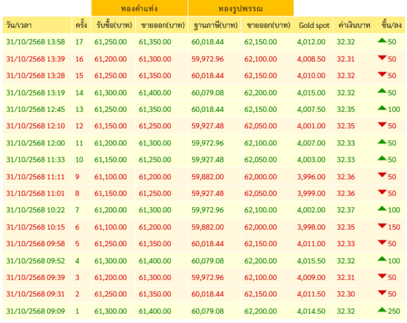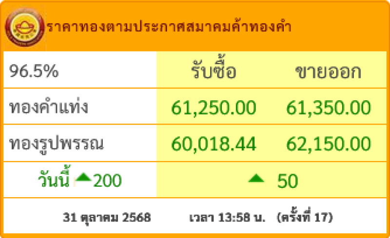 ราคาทองคำ วันที่ 31 ตุลาคม 2568 เวลา 13:58 น. (ครั้งที่ 17)